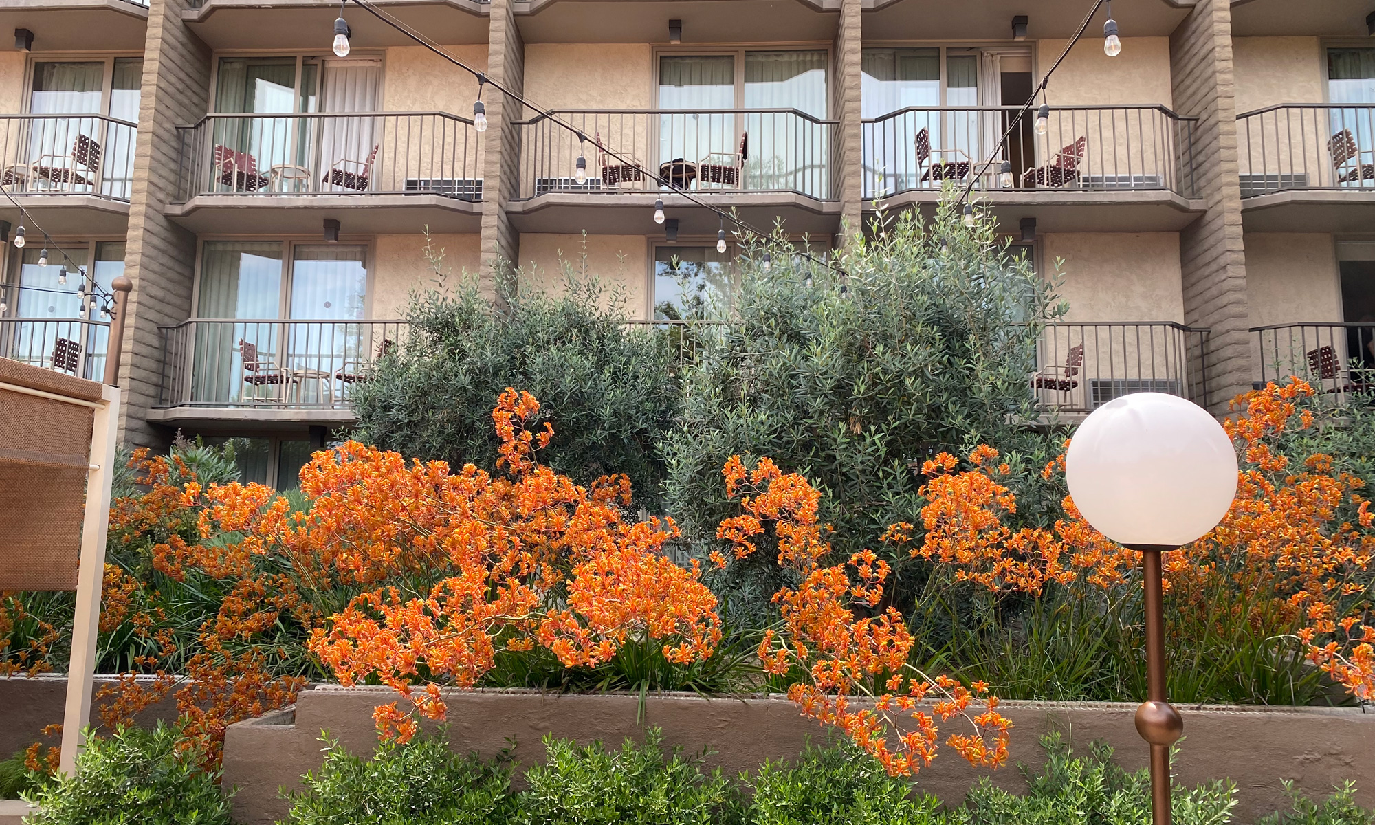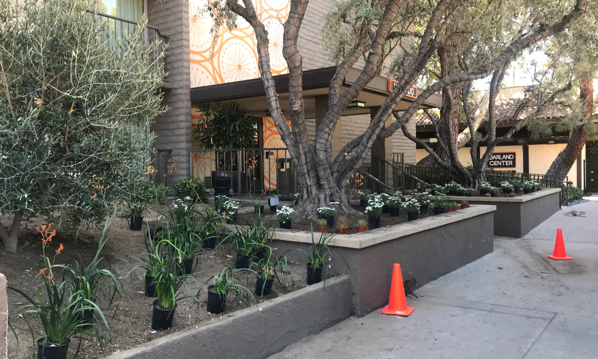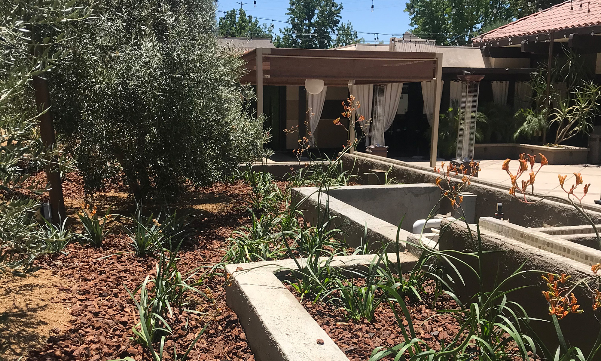 The Garland Hotel is a boutique hotel in North Hollywood. The owners of The Garland asked WG DESIGN to help them renovate their courtyard, a prominent feature at the hotel. The garden is a narrow strip which originally was filled with towering pine trees that needed to be removed. We redesigned the courtyard with Olive trees, orange Kangaroo Paws and various drought tolerant plants. The orange color was a recurring theme to match the motif painted on the hotel walls.