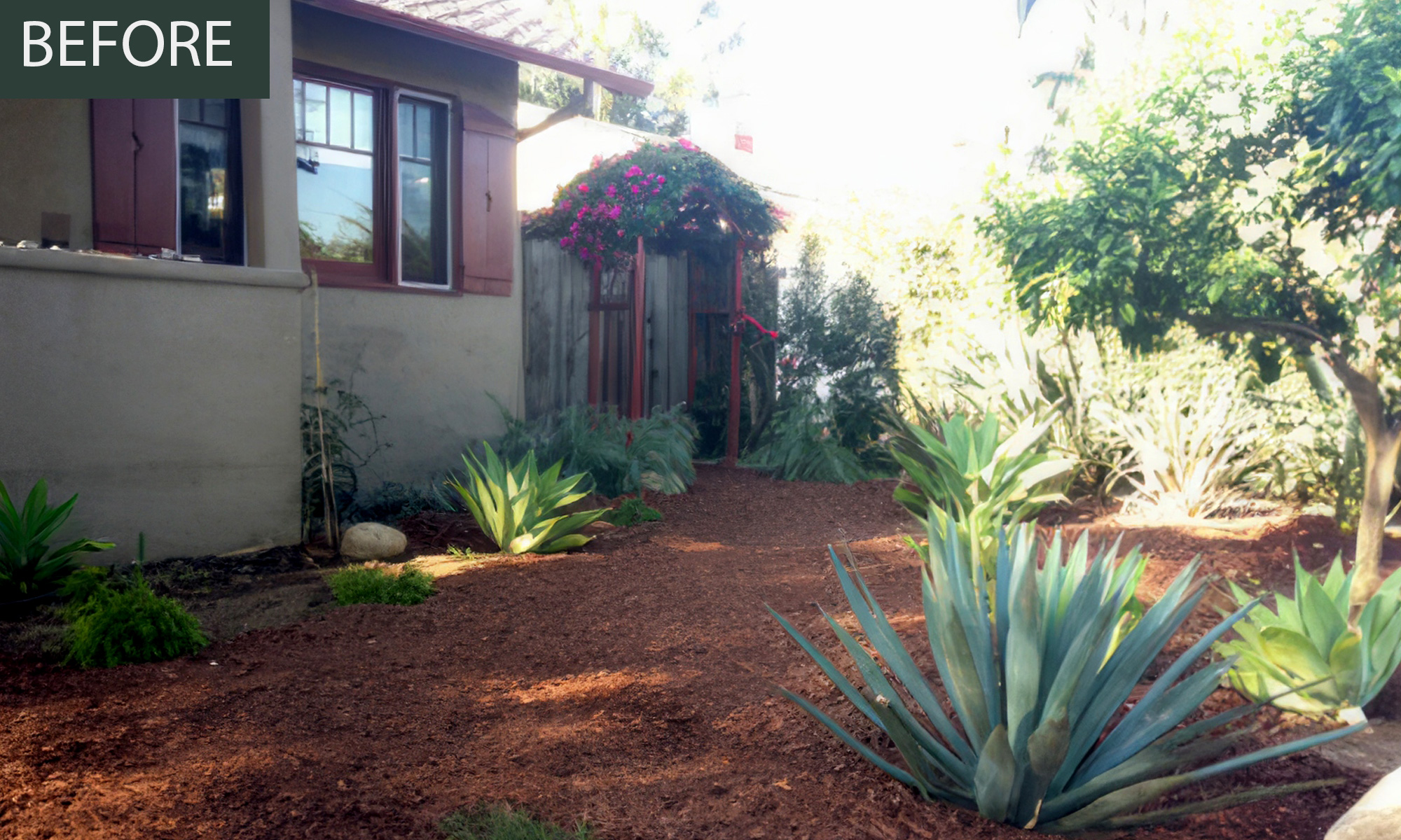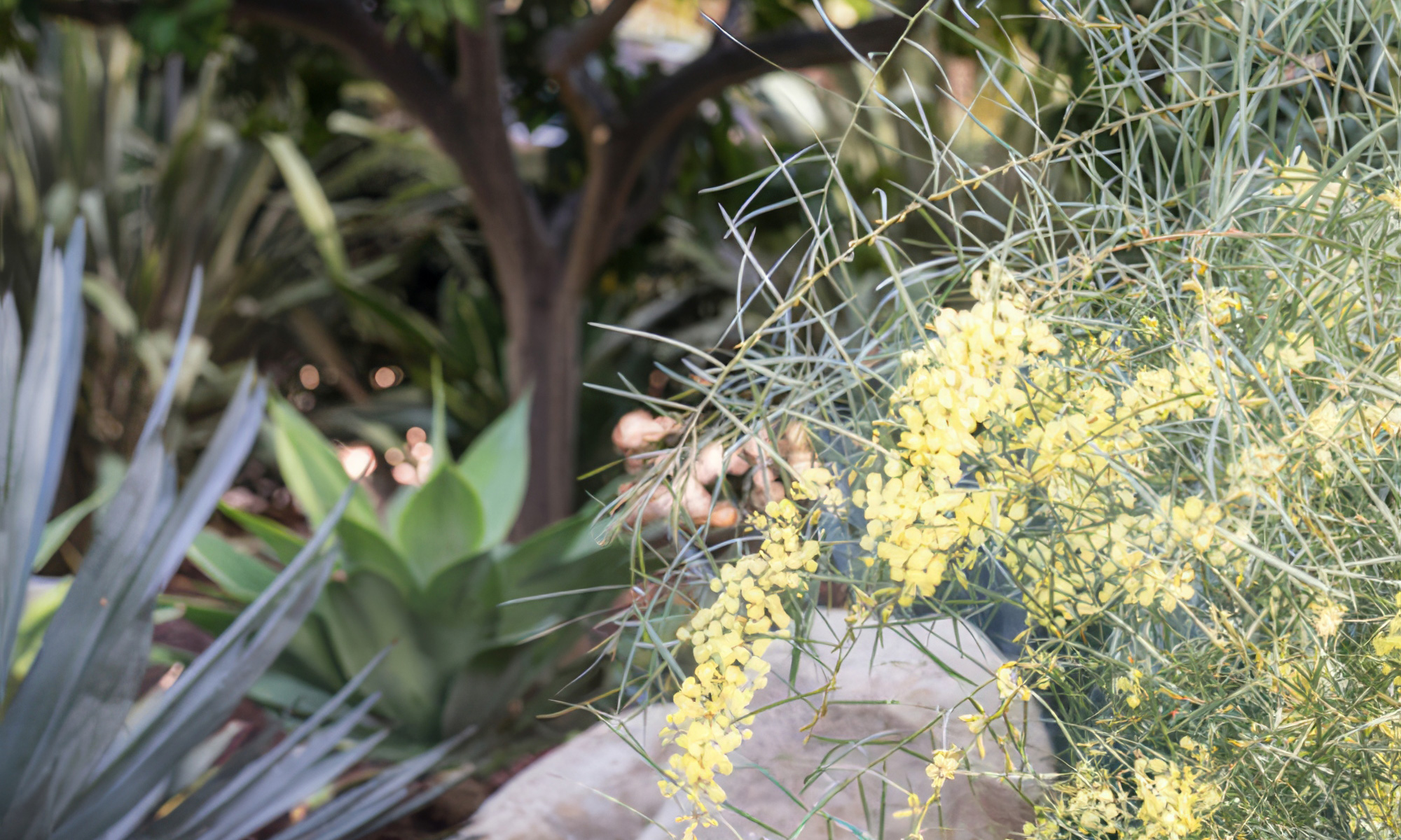 A client asked me to renovate her front yard with drought tolerant plants, color and a look of simplicity. The end effect was a very pretty and soft combination of Acacia Iteaphylla (Willow Wattle) combined with a pink Bougainvillea, Cousin itt, an existing Lemon tree and a few existing Agave.