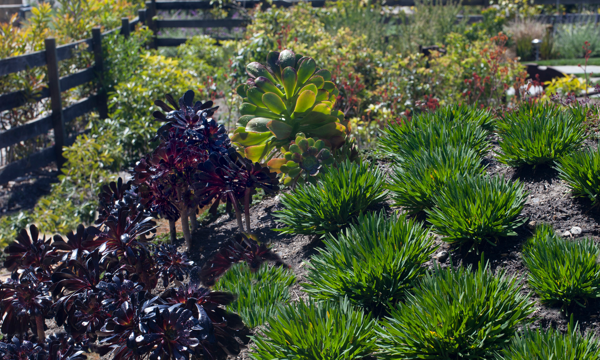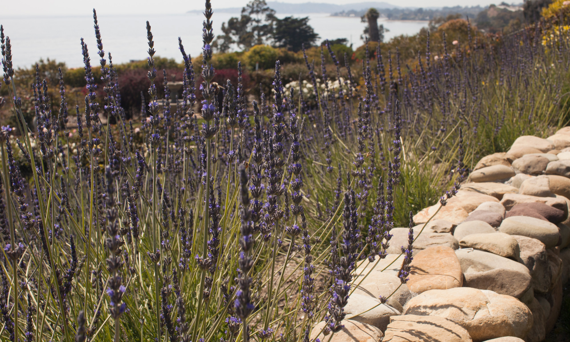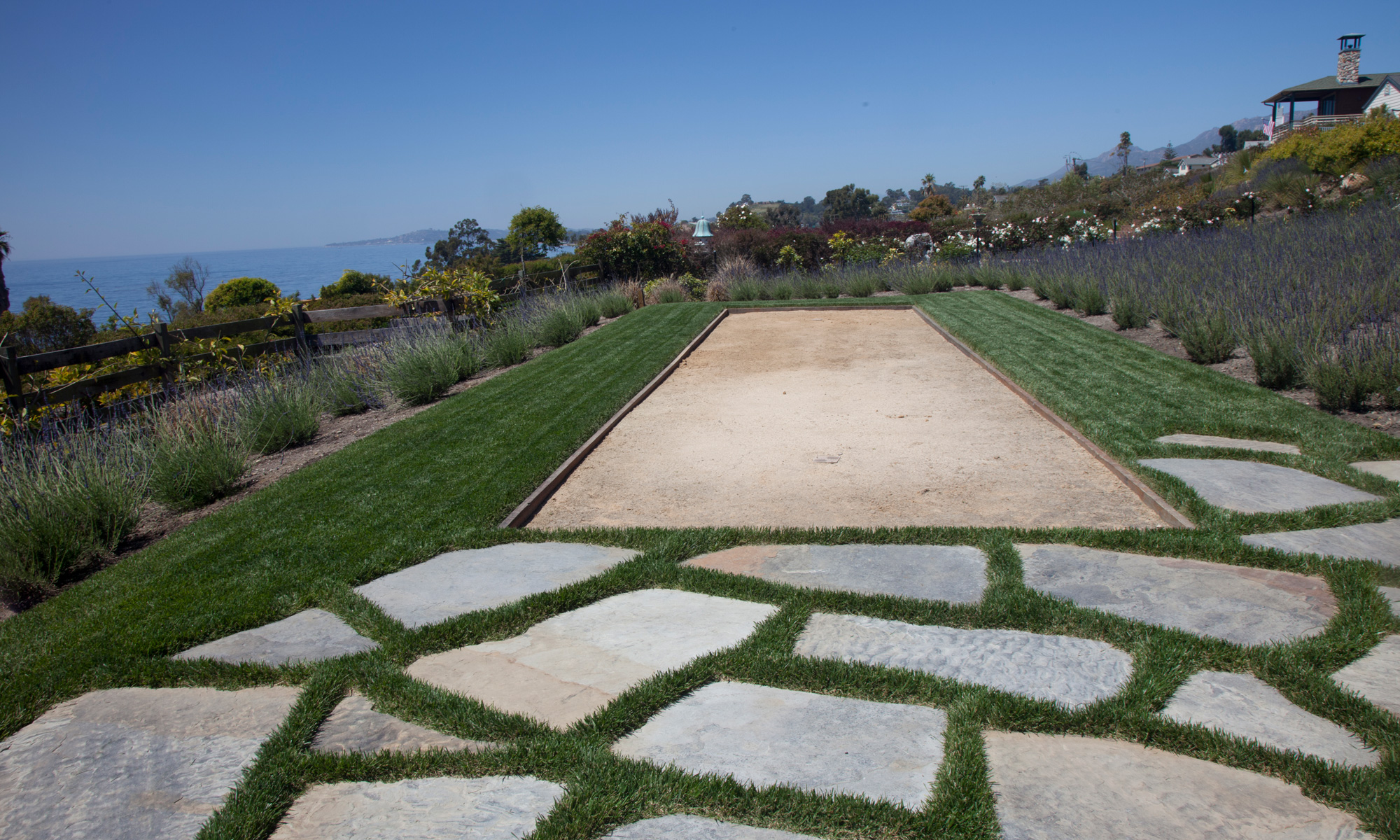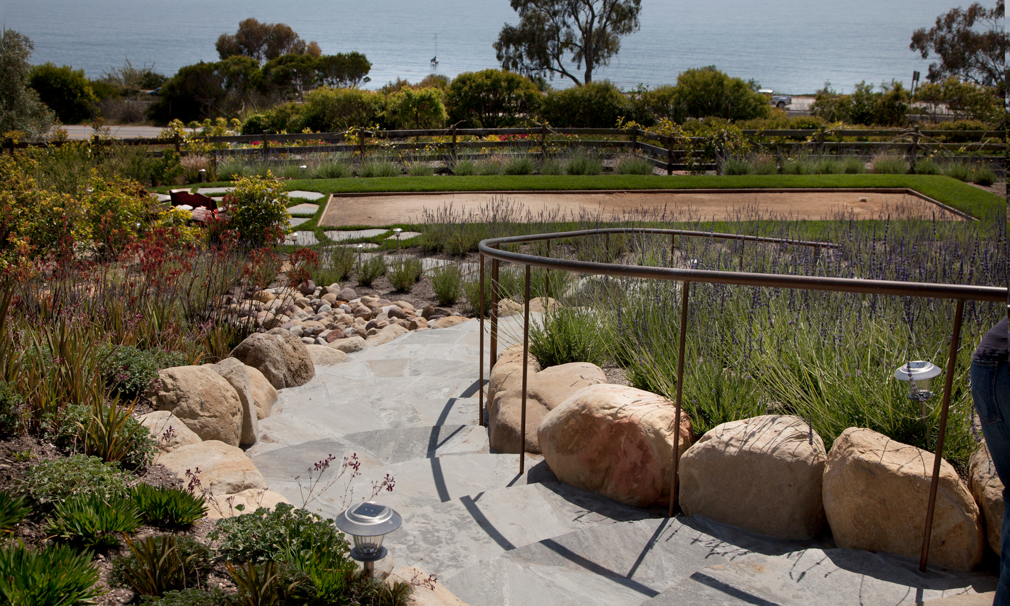 Every plant was carefully chosen for color and fragrance. The final outcome was a beautiful amalgamation of rugged rock walls, a field of Lavender, a rose garden, a Petanque Court, and a hedge of Pittosporum and Osmanthus. Other plants include Olive trees, a Melaleuca tree, vines of Burmese Honeysuckle, Cup of Gold and a grouping of Kangaroo Paw.