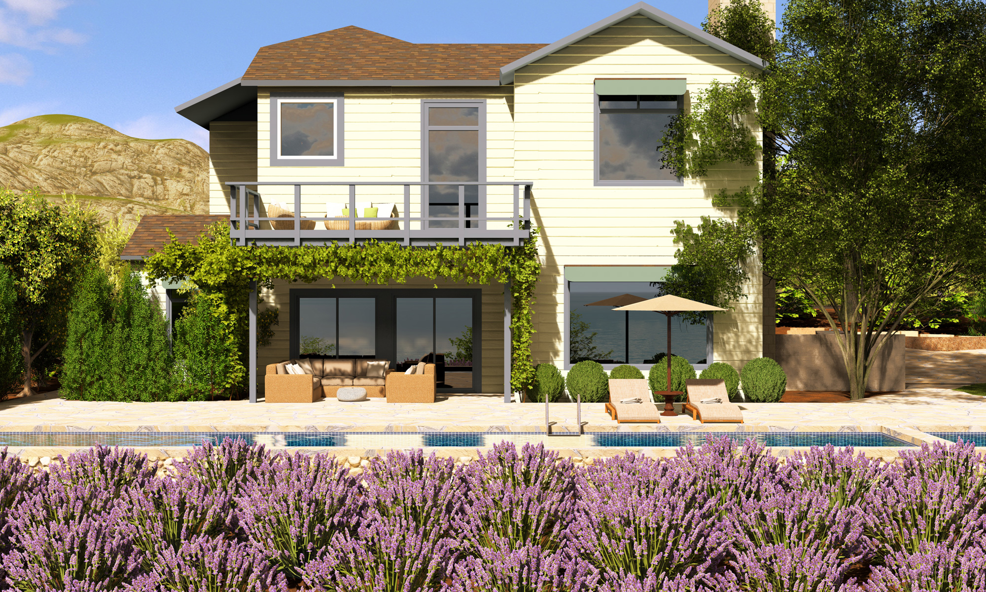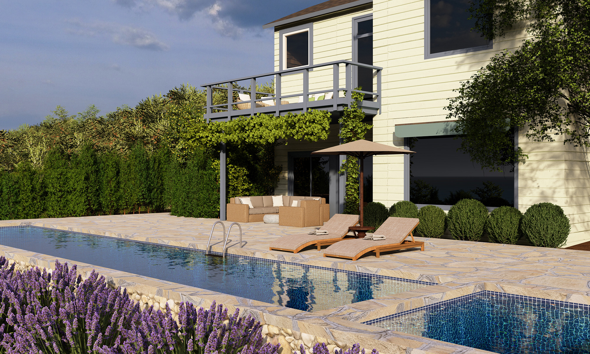 The pool became an extension of the patio which flows right out the back door of the house. The pool will sink in to the hillside so that it is flush with the patio. The wall facing in to the garden will be espaliered with a lemon tree so that it is camouflaged in the garden. The garden will continue to be planted with a field of lavender. A bench is installed in the pool so that when one is not doing laps, they can sit and look out at the ocean, the clouds and the islands in the distance.